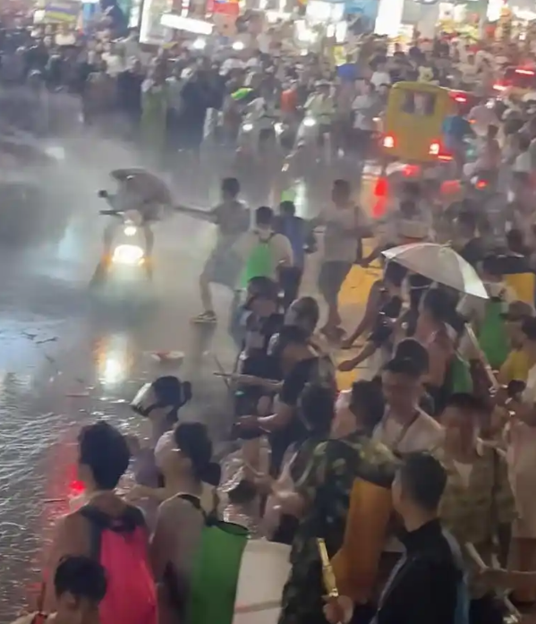 今年大量参与者放弃传统轻泼方式,转而使用改装高压水枪、工业喷水枪、加粗水管等危险工具,近距离强力喷射。