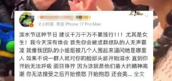 除此之外,路人遭高压水枪围堵袭击、女性被恶意骚扰、老人孩子被无差别泼淋……一桩桩失控行为,让节日沦为噩梦,也让传承千年的民俗文化蒙尘。