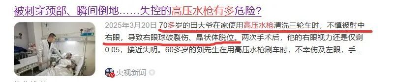 高压水枪的威力很多人还不知道,之前有个新闻是一位70多岁的田大爷在家使用高压水枪清洗三轮车时,不慎被射中右眼,导致右眼球破裂伤、晶状体脱位。