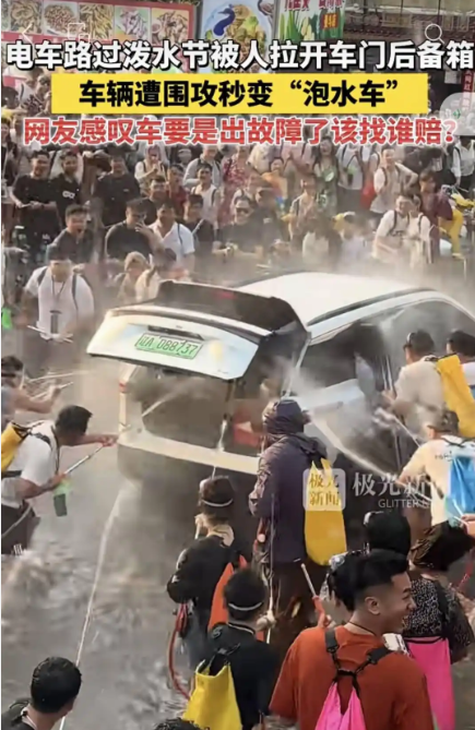 一辆悬挂沈阳牌照的白色新能源SUV正常行驶途中,突然被现场人群围堵。几名游客径直走到车辆后方,强行按下后备箱开关将其打开,随后多人手持高压水枪、拎着水桶,不断向车内猛烈灌水。
