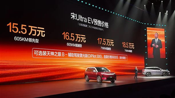 宋Ultra进行预售,预售15.5-18.5万元,4个版本之间各相差1万元,16万的预算有605公里续航,17万多的预算就能有710公里续航。有高阶智驾、有城区辅助、可以选装激光雷达、有前备箱,还有兆瓦闪充。而这些配置和续航出现之后,它已经反超了同价位里的性价比屠夫-零跑C10和C11。
